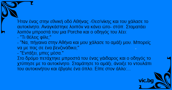 Ήταν ένας στην εθνική οδό Αθήνας -Θεσ/νίκης και του χάλασε το αυτοκίνητο. Αναγκάστηκε λοιπόν να κάνει ώτο- στόπ. Σταματάει λοιπόν μπροστά του μια Porche και ο οδηγός του λέει: