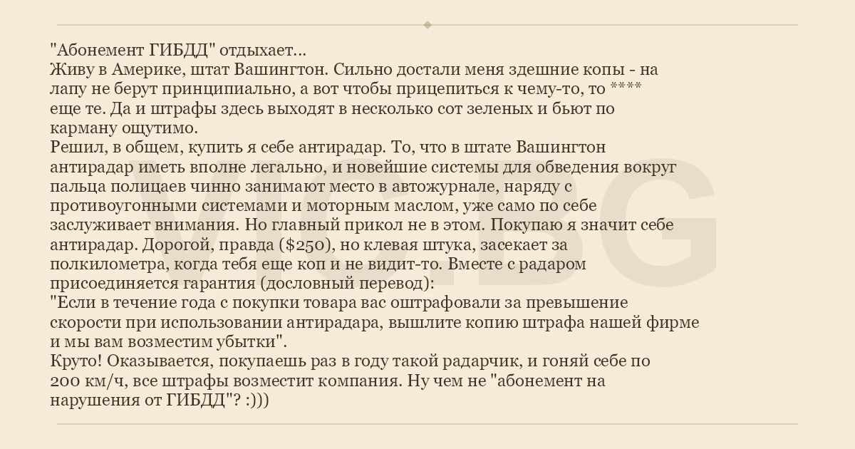 "Абонемент ГИБДД" отдыхает... Живу в Америке, штат Вашингтон. Сильно достали меня здешние копы - на лапу не берут принципиально, а вот чтобы прицепиться к чему-то, то **** еще те. Да и штрафы здесь выходят в несколько сот зеленых и бьют по карману ощутимо. Решил, в общем, купить я себе антирадар. То, что в штате Вашингтон антирадар иметь вполне легально, и новейшие системы для обведения вокруг пальца полицаев чинно занимают место в автожурнале, наряду с противоугонными системами и моторным маслом, уже само по себе заслуживает внимания. Но главный прикол не в этом. Покупаю я значит себе антирадар. Дорогой, правда ($250), но клевая штука, засекает за полкилометра, когда тебя еще коп и не видит-то. Вместе с радаром присоединяется гарантия (дословный перевод): "Если в течение года с покупки товара вас оштрафовали за превышение скорости при использовании антирадара, вышлите копию штрафа нашей фирме и мы вам возместим убытки". Круто! Оказывается, покупаешь раз в году такой радарчик, и гоняй себе по 200 км/ч, все штрафы возместит компания. Ну чем не "абонемент на нарушения от ГИБДД"? :)))