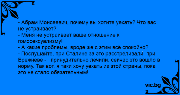 - Послушайте, при Сталине за это расстреливали, при Брежневе - принудительно лечили, сейчас это вошло в норму. Так вот, я таки хочу уехать из этой страны, пока это не стало обязательным!