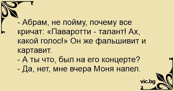 - Абрам, не пойму, почему все кричат: «Паваротти - талант! Ах, какой голос!» Он же фальшивит и картавит.