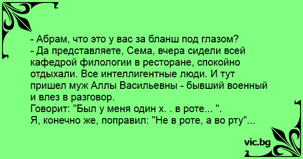 - Да представляете, Сема, вчера сидели всей кафедрой филологии в ресторане, спокойно отдыхали. Все интеллигентные люди. И тут пришел муж Аллы Васильевны - бывший военный и влез в разговор.
