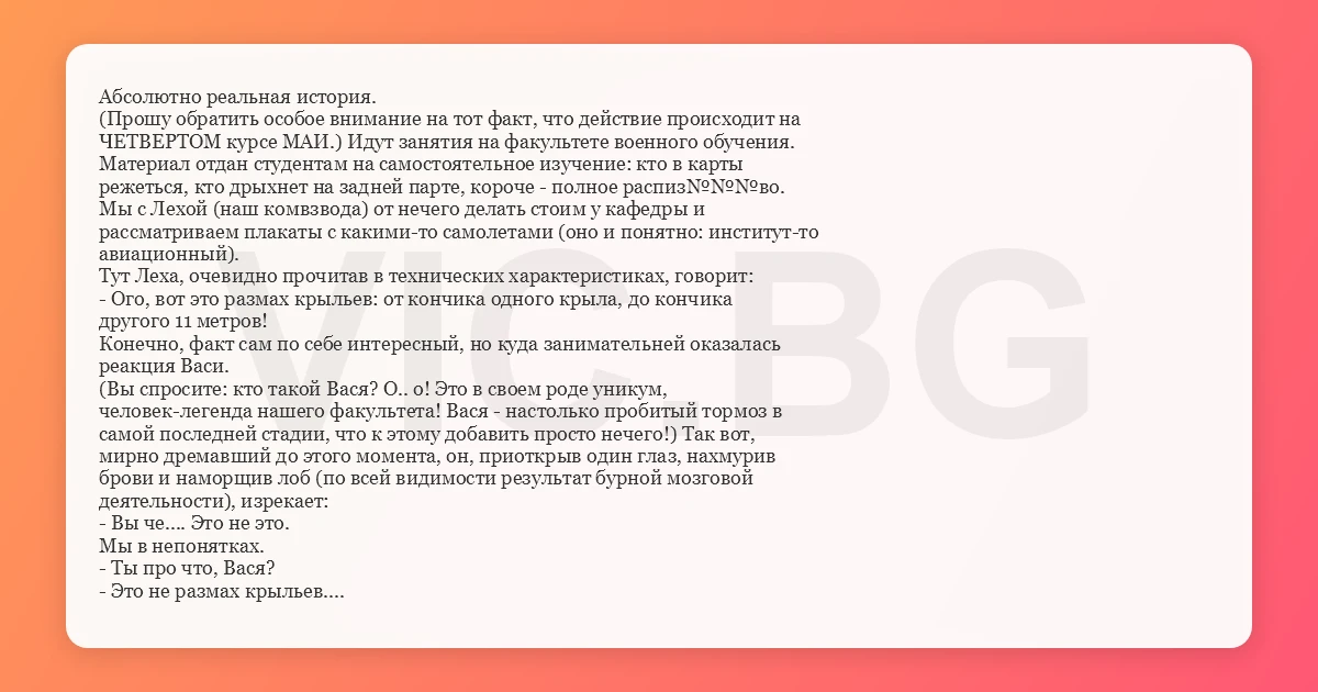 Абсолютно реальная история. (Прошу обратить особое внимание на тот факт, что действие происходит на ЧЕТВЕРТОМ курсе МАИ.) Идут занятия на факультете военного обучения. Материал отдан студентам на самостоятельное изучение: кто в карты режеться, кто дрыхнет на задней парте, короче - полное распиз№№№во. Мы с Лехой (наш комвзвода) от нечего делать стоим у кафедры и рассматриваем плакаты с какими-то самолетами (оно и понятно: институт-то авиационный). Тут Леха, очевидно прочитав в технических характеристиках, говорит: - Ого, вот это размах крыльев: от кончика одного крыла, до кончика другого 11 метров! Конечно, факт сам по себе интересный, но куда занимательней оказалась реакция Васи. (Вы спросите: кто такой Вася? О.. о! Это в своем роде уникум, человек-легенда нашего факультета! Вася - настолько пробитый тормоз в самой последней стадии, что к этому добавить просто нечего!) Так вот, мирно дремавший до этого момента, он, приоткрыв один глаз, нахмурив брови и наморщив лоб (по всей видимости результат бурной мозговой деятельности), изрекает: - Вы че.... Это не это. Мы в непонятках. - Ты про что, Вася? - Это не размах крыльев. В нас просыпается неподдельный интерес: - А что же такое по твоему размах крыльев? (Постараюсь передать) - Нуу... это когда...- продолжительная пауза в поисках подходящих слов, буквально слышно как в его черепной коробке что-то пощелкивает от напряжения, - ну... в общем...- тут его лицо проясняется,- Вот как у птиц... ну это когда птица один раз махнула крыльями... и это, значит, сколько метров пролетела столько и есть размах крыльев! Все в ауте! После этого мы битых полчаса пытались объяснить ему, что же такое "размах крыльев" на самом деле и, как оказалось, не убедили. Спустя довольно продолжительное время, эта история, уже ставшая байкой, пересказывалась в присутствии Васи. После того как все отсмеялись, Вася с победоносным видом и присущей ему крестьянской смекалкой заявляет: - Почему же тогда число Маха?! Вот так, проучившись до 4 курса авиационного института, в конце концов узнаешь, что скорость самолета измеряется в количестве взмахов крыльев! :) ЗЫ: Остается добавить, что после этих слов бедный Мах, наверняка, перевернулся в своем гробу. И слава российским авиаторам!!! BurAN