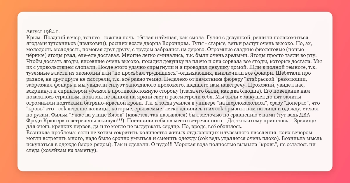 Август 1984 г. Крым. Поздний вечер, точнее - южная ночь, тёплая и тёмная, как смола. Гуляя с девушкой, решили полакомиться ягодами тутовников (шелковиц), росших возле дворца Воронцова. Туты - старые, ветки растут очень высоко. Но, ах, молодость-молодость, помогая друг другу, с трудом забрались на дерево. Огромные сладкие фиолетовые (ночью - чёрные) ягоды рвал, еле-еле доставая. Многие легко сминались, т.к. были очень зрелыми. Ягоды просто таяли во рту. Чтобы достать ягоды, висевшие очень высоко, посадил девушку на плечо и она сорвала все ягоды, которые достала. Мы их с удовольствием слопали. После этого удачно спрыгнули и я проводил девушку домой. Шли в полной темноте, т.к. туземные власти из экономии или "по просьбам трудящихся"-отдыхающих, выключили все фонари. Щебетали про разное, на друг друга не смотрели, т.к. всё равно темно. Недалеко от памятника фюреру "ктябрьской" революции, забрезжил фонарь и мы увидели силуэт запоздалого прохожего, шедшего нам навстречу. Прохожий, увидел нас, вскрикнул и спринтером убежал в противоположную сторону (глаза его были, как два блюдца). Его поведение нам показалось странным, пока мы не вышли на яркий свет и рассмотрели себя. Мы были с макушек до пят залиты огромными подтёками багряно-красной крови. Т.к. я тогда учился в универе "на шерлокахолмса", сразу "допёрло", что "кровь" это - cok ягод шелковицы, которые, срываемые, легко давились и их cok брызгал нам на лица и одежду, стекал по рукам. Фильм "Ужас на улице Вязов" (кажется, так назывался) был мелочью по сравнению с нами (тут ведь ДВА Фреди Крюгера и встречены вживую!!!). Поставили себя на место встреченного... Да, тяжко ему пришлось... Зрелище для очень крепких нервов, да и то могло не выдержать сердце. Но, вроде, всё обошлось. Возникла проблема: если не хотим сократить количество живых отдыхающих и туземного населения, коих вечером могли встретить много, надо было срочно умыться и сменить одежду (cok ведь удаляется очень плохо). Возникла мысль искупаться в одежде (море-рядом). Так и сделали. О чудо!!! Морская вода полностью вымыла "кровь", не осталось ни следа (хозяйкам на заметку).