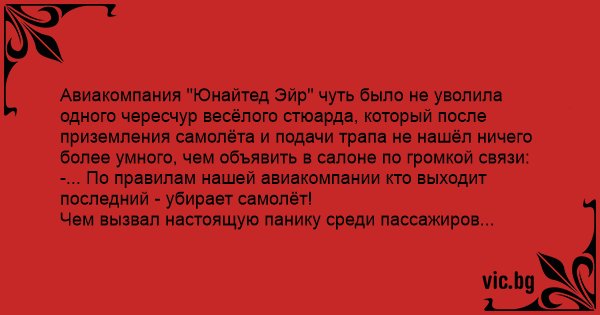 Авиакомпания "Юнайтед Эйр" чуть было не уволила одного чересчур весёлого стюарда, который после приземления самолёта и подачи трапа не нашёл ничего более умного, чем объявить в салоне по громкой связи: