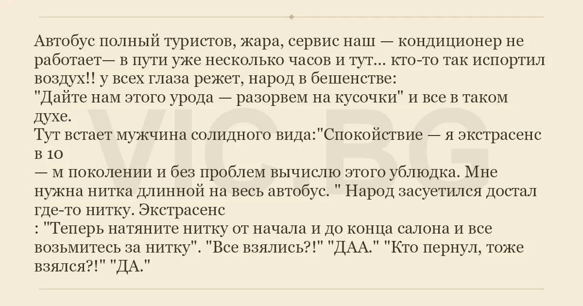 Автобус полный туристов, жара, сервис наш — кондиционер не работает— в пути уже несколько часов и тут... кто-то так испортил воздух!! у всех глаза режет, народ в бешенстве: "Дайте нам этого урода — разорвем на кусочки" и все в таком духе. Тут встает мужчина солидного вида:"Спокойствие — я экстрасенс в 10 — м поколении и без проблем вычислю этого ублюдка. Мне нужна нитка длинной на весь автобус. " Народ засуетился достал где-то нитку. Экстрасенс : "Теперь натяните нитку от начала и до конца салона и все возьмитесь за нитку". "Все взялись?!" "ДАА." "Кто пернул, тоже взялся?!" "ДА."