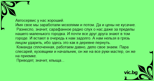 Разнесло, значит, сарафанное радио слух о нас даже за пределы нашего маленького городка. И почти все друг друга знают в том городе. И встают в очередь к нам задолго. А нам нельзя в грязь лицом ударить, ибо здесь это как в деревне пернуть.