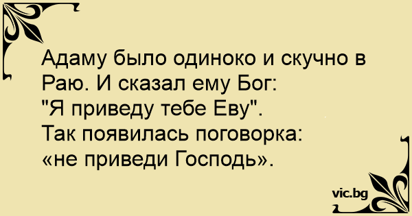 Жив-був Адам. І був він один на усьому білому світі. І сказав йому Бог: - Приведу я тобі Єву ... Так народилася фраза: "Не приведи, Господь!"