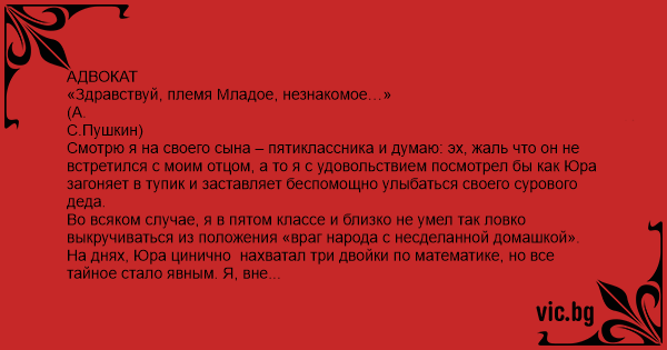 Петр Семенович сначала долго смеялся, потом исправил Алле двойку, а мне сказал: - «За то что рассмешил, прощаю. Вы, молодой человек, великим адвокатом будете…»