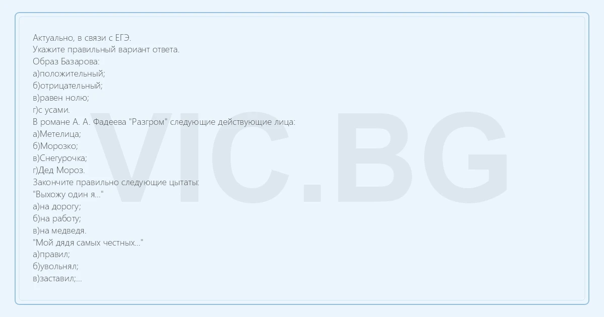 Актуально, в связи с ЕГЭ.<br />Укажите правильный вариант ответа.<br />Образ Базарова:<br />а)положительный;<br />б)отрицательный;<br />в)равен нолю;<br />г)с усами.<br />В романе А. А. Фадеева "Разгром" следующие действующие лица:<br />а)Метелица;<br />б)Морозко;<br />в)Снегурочка;<br />г)Дед Мороз.<br />Закончите правильно следующие цытаты:<br />"Выхожу один я..."<br />а)на дорогу;<br />б)на работу;<br />в)на медведя.<br />"Мой дядя самых честных..."<br />а)правил;<br />б)увольнял;<br />в)заставил;<br />г)выдумать не мог.<br />"Восстал он против мнений света один, как прежде и -..."<br />а)убит;<br />б)ранен;<br />в)пропал без вести;<br />г)умер своей смертью.<br />"Быть или не быть - вот в чём..."<br />а)мать родила;<br />б)вопрос;<br />в)ответ;<br />г)ответа нету;<br />д)гони монету.<br />Маяковский написал поэму "...!"<br />а)хорошо;<br />б)удовлетворительно;<br />в)отлично, Константин;<br />г)нормально, Григорий.<br />"Редкая... долетит до середины Днепра!"<br />а)cboлoчь;<br />б)но меткая;<br />в)старуха-процентщица;<br />г)птица-тройка.<br />"Глупый пингвин робко прячет... в утёсах"<br />а)тело жирное;<br />б)постную грудинку;<br />в)заначку;<br />г)акваланг, оружие и документы.<br />Андрей Кнышев. ©<br />Петрушка