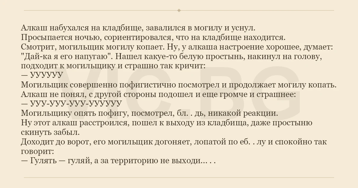 Алкаш набухался на кладбище, завалился в могилу и уснул. Просыпается ночью, сориентировался, что на кладбище находится. Смотрит, могильщик могилу копает. Ну, у алкаша настроение хорошее, думает: "Дай-ка я его напугаю". Нашел какуе-то белую простынь, накинул на голову, подходит к могильщику и страшно так кричит: — УУУУУУ Могильщик совершенно пофигистично посмотрел и продолжает могилу копать. Алкаш не понял, с другой стороны подошел и еще громче и страшнее: — УУУ-УУУ-УУУ-УУУУУУ Могильщику опять пофигу, посмотрел, бл. . дь, никакой реакции. Ну этот алкаш расстроился, пошел к выходу из кладбища, даже простыню скинуть забыл. Доходит до ворот, его могильщик догоняет, лопатой по еб. . лу и спокойно так говорит: — Гулять — гуляй, а за территорию не выходи... . .