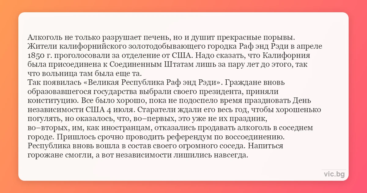 Алкоголь не только разрушает печень, но и душит прекрасные порывы. Жители калифорнийского золотодобывающего городка Раф энд Рэди в апреле 1850 г. проголосовали за отделение от США. Надо сказать, что Калифорния была присоединена к Соединенным Штатам лишь за пару лет до этого, так что вольница там была еще та. Так появилась «Великая Республика Раф энд Рэди». Граждане вновь образовавшегося государства выбрали своего президента, приняли конституцию. Все было хорошо, пока не подоспело время праздновать День независимости США 4 июля. Старатели ждали его весь год, чтобы хорошенько погулять, но оказалось, что, во–первых, это уже не их праздник, во–вторых, им, как иностранцам, отказались продавать алкоголь в соседнем городе. Пришлось срочно проводить референдум по воссоединению. Республика вновь вошла в состав своего огромного соседа. Напиться горожане смогли, а вот независимости лишились навсегда.