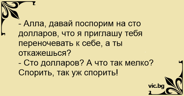 - Алла, давай поспорим на сто долларов, что я приглашу тебя переночевать к себе, а ты откажешься?