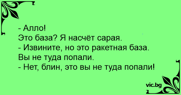- Алло! Это база? Я насчёт сарая. - Извините, но это ракетная база. Вы не туда попали. - Нет, блин, это вы не туда попали!