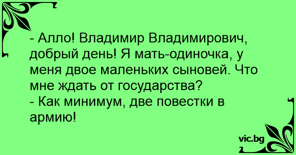 - Алло! Владимир Владимирович, добрый день! Я мать-одиночка, у меня двое маленьких сыновей. Что мне ждать от государства?<br />- Как минимум, две повестки в армию!