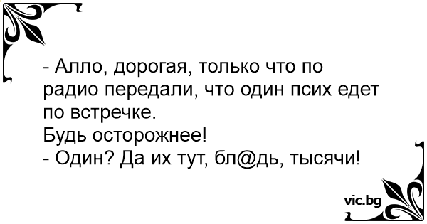 Спротивен правец El conductor borracho en dirección contraria Geisterfahrer zwischen München und Salzburg Παρανοϊκός O πόντιος στο Λονδίνο Шофоьор на камион карал по магистралата Париж-Лион. Va un gallego conduciendo por Londres y pone la radio, cuando justo emitían las noticias, y escucha: Eine Blondine fährt auf der Autobahn und hört Radio. Der Sprecher gibt eine Eilmeldung durch: An old guy in his Volvo is driving home from work when his wife rings him on his carphone. Deux blondes sont en voiture. En consultant l'info trafic sur son téléphone, la copilote paniquée dit à la conductrice : As a senior citizen was driving down the freeway, his car phone rang. A blonde was driving down the motorway when her car phone rang. Tor Arne åkte på en svensk motorväg när han hörde ett meddelande på bilradion: - Det är en galning som kör åt fel håll på motorvägen. - En???? Det är ju hundratals... C'est une blonde qui se promène en auto. à la radio, on annonce un message important: "Attention ! Sur la rue Ste-Catherine, une femme circule avec son auto en sens contraire du trafic !" Et la blonde se dit: "ils sont nuls y'en a pas qu'une, ils sont... A woman is driving for 1st time on the highway. Her husband calls says: "Be careful love, It's just been on the radio, that someone is driving opposite to the traffic on the highway.." She replies:... Un belge est en train de rouler sur l'autoroute tout en écoutant la radio: " ... ATTENTION, ATTENTION nous avons un communiqué spécial de la gendarmerie: on nous signale qu'un automobiliste roule à... En norsk kör på tyska autobahn med hög hastighet. Rätt som det är varnar man på bilradion för en galning, som kör på fel sida av vägen, mot trafiken. När turisten hör detta utbrister han: - En!?... Ein Autofahrer hört ausm Radio: "Ein Geisterfahrer auf der A7!" Sagt der Fahrer: "Was? Einer? Hundert!" Había un señor que iba conduciendo, prende la radio y escucha: "Hoy, un maniático se ha ido contra el tránsito y nadie ha podido atraparlo" Y luego el hombre dice: ¿Qué? ¿Uno? ¡Son miles! En mann satt bilen sin på veg til Oslo. Han skrudde på radioen, og hørte trafikkmeldingen: - Alle de som kjører opp mot Trøndelag må være forsiktige. Det er en mann som kjører i feil fil - En!... Det var en gang en svenske som var ute og kjørte bil, plutselg kom det en nyhetsending. Reporteren: – Vi melder om at en bil kjører mot kjøreretningen på E6 i nord-gående retning. Svensken: EN?!... C'est l'histoire d'une blonde qui roule sur une départemental quand elle entend un message radio important: '- Avis aux personnes roulant sur la departemental 2335 une voiture roule en sens... Un tip merge pe autostrada 57 cu masina si asculta radioul. La un moment dat, la radio, crainica anunta: - Pe autostrada 57, un nebun merge pe contrasens. Tipul foarte enervat: - Nu unul, sute, sute ! Va un gallego de visita por navidad conduciendo en coche por Inglaterra y escucha las noticias: -¡ Atención! mucho ojo en la carretera que hay un loco conduciendo en sentido contrario. Y el gallego... Un loco va conduciendo por la autopista en dirección contraria y oye por la radio: - La Guardia Civil alerta de que hay un coche que va en dirección contraria. Y el loco dice: -¿ Uno? ¡Si van todos! Temel bir gün e-5 karayoluna ters yönden girmiş. Bunu fark eden trafik polisleri yol üzerinde seyreden araçları uyarmak için telsizden "e-5 te bir araç ters yönde seyretmektedir." diye anons... Temel x otoyolunda araba sürerken bir yandan da radyo dinlemektedir... çalan şarkı bir anda kesilmiş ve bir anons gelmiş: - X otoyolunda ilerleyen sürücülerin dikkatine! bir araç ters yönde seyir... Un automobilista ubriaco sbaglia l’entrata in autostrada e si immette in senso contrario, creando lo scompiglio nel traffico. Mentre ascolta la radio sente le ultime dal radio-giornale: “…ci e’... Jede takhle řidič auta a jen tak si pustí rádio a tam slyší: Po Mostecké dálnici jede nějakej zkurvenej debil v protisměru!!! Řidič vypne rádio a stěžuje si: Kéž by jen jeden, ale tady jede v... Žmona skambina naujajm rusui į mobilųjį telefoną: - Tu dabar magistrale važiuoji? - Taip, brangute. - Greitai stabdyk ir suk į kelkraštį. Per radiją policija pranešė, kad kažkoks vienas pusprotis... Skambina naujam rusui žmona ir sako. - Tu dabar važiuoji. - Jo o kas yra. - Greit stok šalikelėj per žinias pranešė kad kažkoks idiotas važiuoja priešinga eismui kelio puse. - Gerai būtį kad tik...