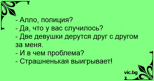 - Полицията? Están dos mujeres en la calle peleando, y sale u gitano corriendo hacia la estación de policías. Y le grita al policía: "Pronto, Carabinieri?" "Sì, mi dica!" "Due donne si stanno picchiando per me!" "E mi scusi, quale sarebbe il problema?" "Sta avendo la meglio quella che non mi piace!" "Arriviamo subito!" - Алло, полиция? - Да, что у вас случилось? - Две девушки дерутся друг с дружкой за меня. - Молодой человек, а в чём, собственно, проблема? - Страшненькая побеждает! Boy: *calls 911* Hello? I need your help! 911: Alright, What is it? Boy: Two girls are fighting over me! 911: So what's your emergency? Boy: The ugly one is winning. Ein Mann ruft bei der Polizei an: "Herr Wachtmeister, kommen Sie schnell, hier schlagen sich zwei Frauen um mich!" "Wo ist das Problem?" "Ich glaube, die Dicke gewinnt!" - Allo, la police ? Vous pourriez intervenir sur le trottoir, rue des lilas ? Il y a deux femmes qui se battent violemment pour moi, depuis plus d'une demi-heure! - Depuis plus d'une demi-heure ?... -Policía! hay dos mujeres que se están peleando por mi! -Y que problema hay? -Pues que va ganando la fea! - Alio, ar čia policija? - Taip, kas atsitiko? - Dvi merginos mušasi dėl manęs. - O kas čia blogo? - Baisioji laimi. - Allô la police! - Oui allô. - 2 filles se battent pour moi. - Et alors? - La moche est entrain de gagnée. - Alio, policija? - Taip, kas nutiko? - Dvi merginos mušasi dėl manęs. - Tai ką? - Baisesnė laimi. - Tuoj atvažiuojam.