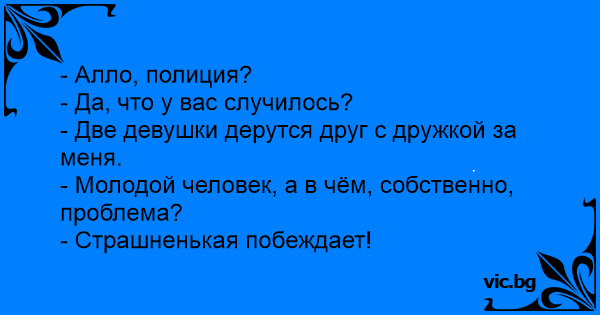 - Alio, ar čia policija? - Taip, kas atsitiko? - Dvi merginos mušasi dėl manęs. - O kas čia blogo? - Baisioji laimi.