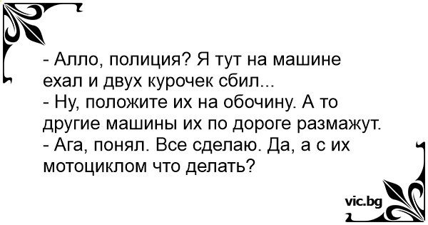 - Алло, полиция? Я тут на машине ехал и двух курочек сбил...