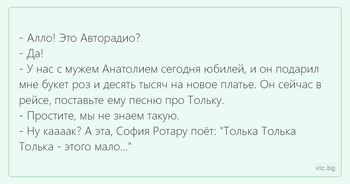- У нас с мужем Анатолием сегодня юбилей, и он подарил мне букет роз и десять тысяч на новое платье. Он сейчас в рейсе, поставьте ему песню про Тольку.