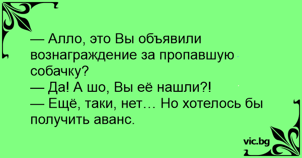 — Алло, это Вы объявили вознаграждение за пропавшую собачку?<br />— Да! А шо, Вы её нашли?! <br />— Ещё, таки, нет… Но хотелось бы получить аванс.