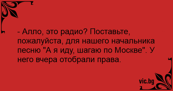 - Алло, это радио? Поставьте, пожалуйста, для нашего начальника песню "А я иду, шагаю по Москве". У него вчера отобрали права.
