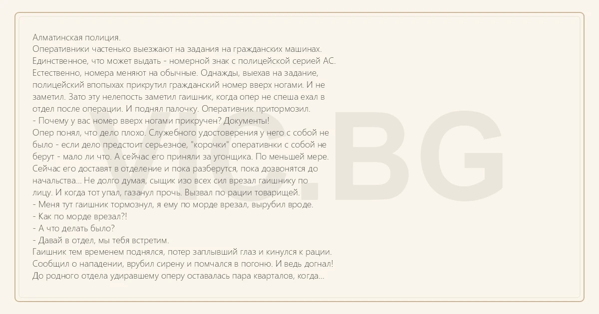 Алматинская полиция. Оперативники частенько выезжают на задания на гражданских машинах. Единственное, что может выдать - номерной знак с полицейской серией АС. Естественно, номера меняют на обычные. Однажды, выехав на задание, полицейский впопыхах прикрутил гражданский номер вверх ногами. И не заметил. Зато эту нелепость заметил гаишник, когда опер не спеша ехал в отдел после операции. И поднял палочку. Оперативник притормозил. - Почему у вас номер вверх ногами прикручен? Документы! Опер понял, что дело плохо. Служебного удостоверения у него с собой не было - если дело предстоит серьезное, "корочки" оперативнки с собой не берут - мало ли что. А сейчас его приняли за угонщика. По меньшей мере. Сейчас его доставят в отделение и пока разберутся, пока дозвонятся до начальства... Не долго думая, сыщик изо всех сил врезал гаишнику по лицу. И когда тот упал, газанул прочь. Вызвал по рации товарищей. - Меня тут гаишник тормознул, я ему по морде врезал, вырубил вроде. - Как по морде врезал?! - А что делать было? - Давай в отдел, мы тебя встретим. Гаишник тем временем поднялся, потер заплывший глаз и кинулся к рации. Сообщил о нападении, врубил сирену и помчался в погоню. И ведь догнал! До родного отдела удиравшему оперу оставалась пара кварталов, когда преследователь повис на хвосте и сообщил свои координаты. Оперативник гнал с отчаянием зайца, которого вот-вот схватит борзая. Он лихо затормозил перед центральным входом, где его прибытия уже ждала вся опергруппа. Выскочил из машины, выхватил приготовленное сослуживцами удостоверение и тут на территорию одна за другой влетели три машины дорожной полиции. Побитый гаишник, увидев обидчика, не торопясь вылез из машины. Тот сделал шаг ему навстречу и представившись, раскрыл удостоверение. Тот его внимательно просмотрел. - Да, понятно теперь все. А номер-то че кверх ногами прицепил? - Да торопился, запарился... Гаишник понимающе кивнул, опер облегченно вздохнул и тут же растянулся на асфальте от сильнейшего удара в челюсть. - Вот теперь действительно все в порядке, - удовлетворенно сказал представитель дорожной полиции и помог пострадавшему подняться.