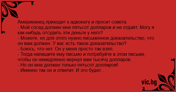 - Мой сосед должен мне пятьсот долларов и не отдаёт. Могу я как-нибудь отсудить эти деньги у него?