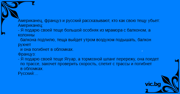Американец, француз и русский рассказывают, кто как свою тещу убьет: