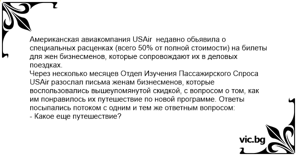 Американская авиакомпания USAir недавно обьявила о специальных расценках (всего 50% от полной стоимости) на билеты для жен бизнесменов, которые сопровождают их в деловых поездках.
