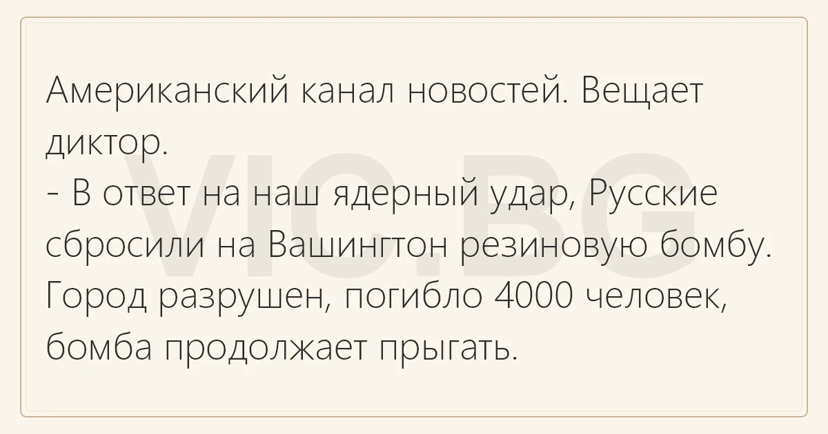 - В ответ на наш ядерный удар, Русские сбросили на Вашингтон резиновую бомбу. Город разрушен, погибло 4000 человек, бомба продолжает прыгать.