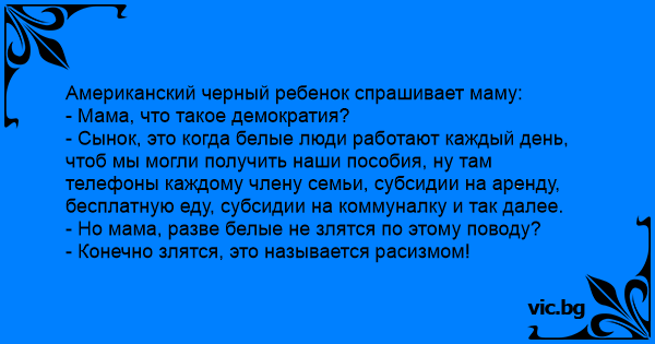 - Сынок, это когда белые люди работают каждый день, чтоб мы могли получить наши пособия, ну там телефоны каждому члену семьи, субсидии на аренду, бесплатную еду, субсидии на коммуналку и так далее.