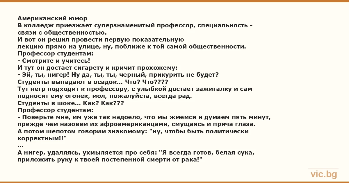 связи с общественностью. И вот он решил провести первую показательную лекцию прямо на улице, ну, поближе к той самой общественности. Профессор студентам: - Смотрите и учитесь! И тут он достает сигарету и кричит прохожему: - Эй, ты, нигер! Ну да, ты, ты, черный, прикурить не будет? Студенты выпадают в осадок... Что? Что???? Тут нeгp подходит к профессору, с улыбкой достает зажигалку и сам подносит ему огонек, мол, пожалуйста, всегда рад. Студенты в шоке... Как? Как??? Профессор студентам: - Поверьте мне, им уже так надоело, что мы жмемся и думаем пять минут, прежде чем назовем их афроамериканцами, смущаясь и пряча глаза. А потом шепотом говорим знакомому: "ну, чтобы быть политически корректным!!" ... А нигер, удаляясь, ухмыляется про себя: "Я всегда готов, белая cуka, приложить руку к твоей постепенной смерти от рака!"