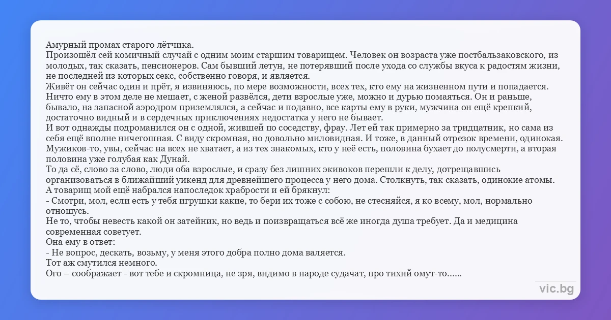 Произошёл сей комичный случай с одним моим старшим товарищем. Человек он возраста уже постбальзаковского, из молодых, так сказать, пенсионеров. Сам бывший летун, не потерявший после ухода со службы вкуса к радостям жизни, не последней из которых cekc, собственно говоря, и является.