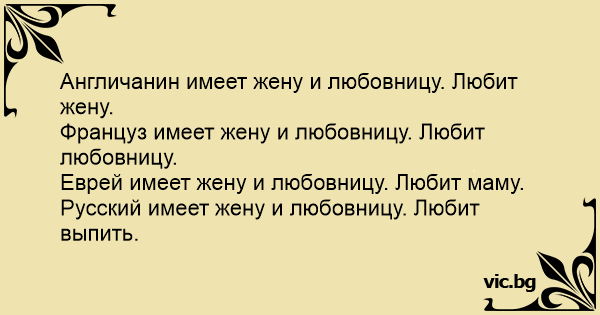 Русский имеет жену и любовницу. Любит выпить.