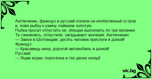 Англичанин, француз и русский попали на необитаемый остров и, ловя рыбку к ужину, поймали золотую.