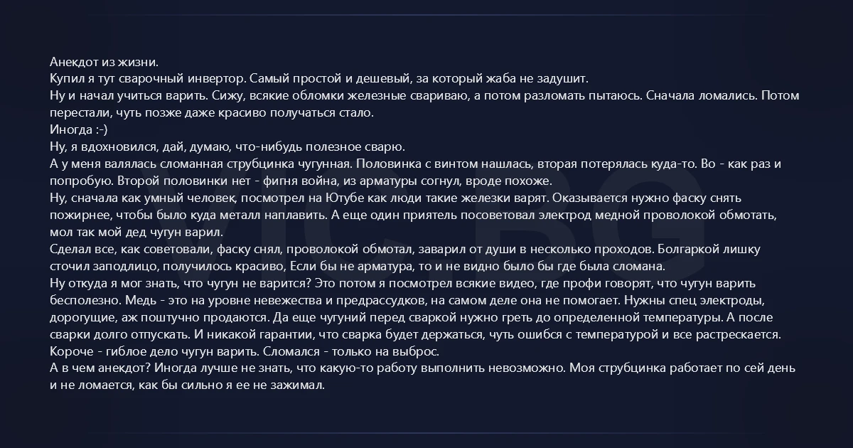 Анекдот из жизни. Купил я тут сварочный инвертор. Самый простой и дешевый, за который жаба не задушит. Ну и начал учиться варить. Сижу, всякие обломки железные свариваю, а потом разломать пытаюсь. Сначала ломались. Потом перестали, чуть позже даже красиво получаться стало. Иногда :-) Ну, я вдохновился, дай, думаю, что-нибудь полезное сварю. А у меня валялась сломанная струбцинка чугунная. Половинка с винтом нашлась, вторая потерялась куда-то. Во - как раз и попробую. Второй половинки нет - фигня война, из арматуры согнул, вроде похоже. Ну, сначала как умный человек, посмотрел на Ютубе как люди такие железки варят. Оказывается нужно фаску снять пожирнее, чтобы было куда металл наплавить. А еще один приятель посоветовал электрод медной проволокой обмотать, мол так мой дед чугун варил. Сделал все, как советовали, фаску снял, проволокой обмотал, заварил от души в несколько проходов. Болгаркой лишку сточил заподлицо, получилось красиво, Если бы не арматура, то и не видно было бы где была сломана. Ну откуда я мог знать, что чугун не варится? Это потом я посмотрел всякие видео, где профи говорят, что чугун варить бесполезно. Медь - это на уровне невежества и предрассудков, на самом деле она не помогает. Нужны спец электроды, дорогущие, аж поштучно продаются. Да еще чугуний перед сваркой нужно греть до определенной температуры. А после сварки долго отпускать. И никакой гарантии, что сварка будет держаться, чуть ошибся с температурой и все растрескается. Короче - гиблое дело чугун варить. Сломался - только на выброс. А в чем анекдот? Иногда лучше не знать, что какую-то работу выполнить невозможно. Моя струбцинка работает по сей день и не ломается, как бы сильно я ее не зажимал.