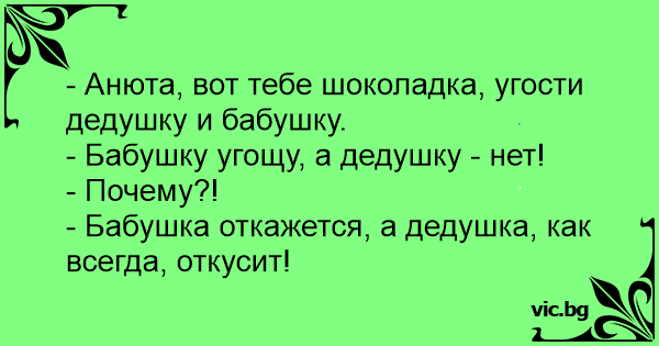 - Анюта, вот тебе шоколадка, угости дедушку и бабушку.