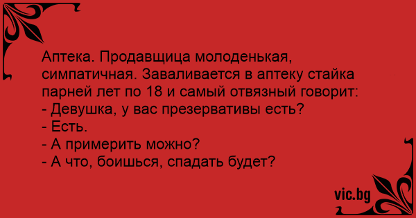 Аптека. Продавщица молоденькая, симпатичная. Заваливается в аптеку стайка парней лет по 18 и самый отвязный говорит: