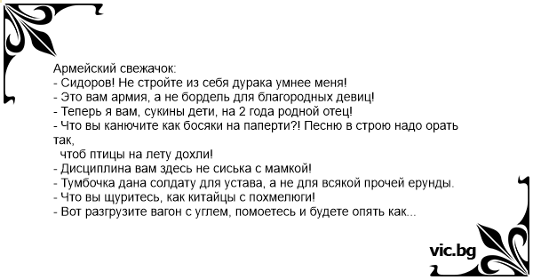 Армейский свежачок: - Сидоров! Не стройте из себя дурака умнее меня! - Это вам армия, а не бордель для благородных девиц! - Теперь я вам, сукины дети, на 2 года родной отец! - Что вы канючите как босяки на паперти?! Песню в строю надо орать так, чтоб птицы на лету дохли! - Дисциплина вам здесь не сиська с мамкой! - Тумбочка дана солдату для устава, а не для всякой прочей ерунды. - Что вы щуритесь, как китайцы с похмелюги! - Вот разгрузите вагон с углем, помоетесь и будете опять как белые негры. - А кто будет нагло втихаря дышать в противогазе, пробежит еще два круга. - Будете лежать здесь на плацу до 7-го пота. - Думаете мне легко?! Не каждый дуpak согласится вами умниками командовать! - Ща, берете лопаты и на самоподготовку. - Думать надо головой, а не лычками на плечах. - Здесь вам не за самоваром с блинами тещу танцевать! - Обматерил бы я вас, бля, козлы позорные, да устав не позволяет!