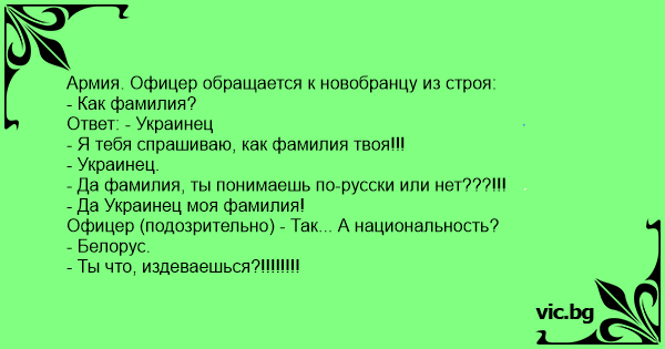 Армия. Офицер обращается к новобранцу из строя: - Как фамилия? Ответ: - Украинец - Я тебя спрашиваю, как фамилия твоя!!! - Украинец. - Да фамилия, ты понимаешь по-русски или нет???!!! - Да Украинец моя фамилия! Офицер (подозрительно) - Так... А национальность? - Белорус. - Ты что, издеваешься?!!!!!!!!