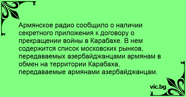 Армянское радио сообщило о наличии секретного приложения к договору о прекращении войны в Карабахе. В нем содержится список московских рынков, передаваемых азербайджанцами армянам в обмен на территории Карабаха, передаваемые армянами азербайджанцам.