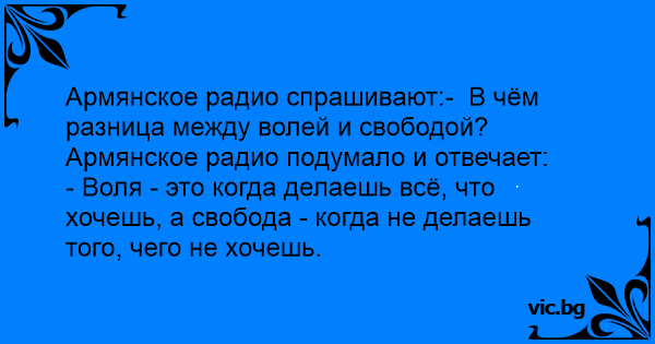 Армянское радио спрашивают:- В чём разница между волей и свободой?