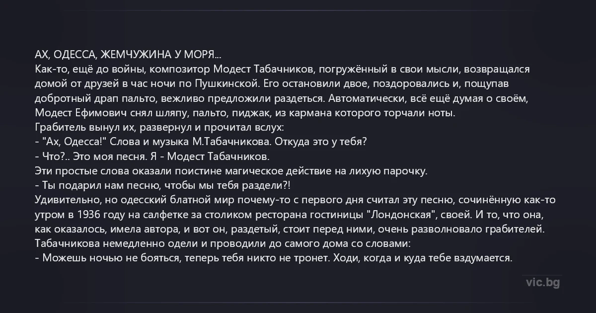 Удивительно, но одесский блатной мир почему-то с первого дня считал эту песню, сочинённую как-то утром в 1936 году на салфетке за столиком ресторана гостиницы "Лондонская", своей. И то, что она, как оказалось, имела автора, и вот он, раздетый, стоит перед ними, очень разволновало грабителей. Табачникова немедленно одели и проводили до самого дома со словами: