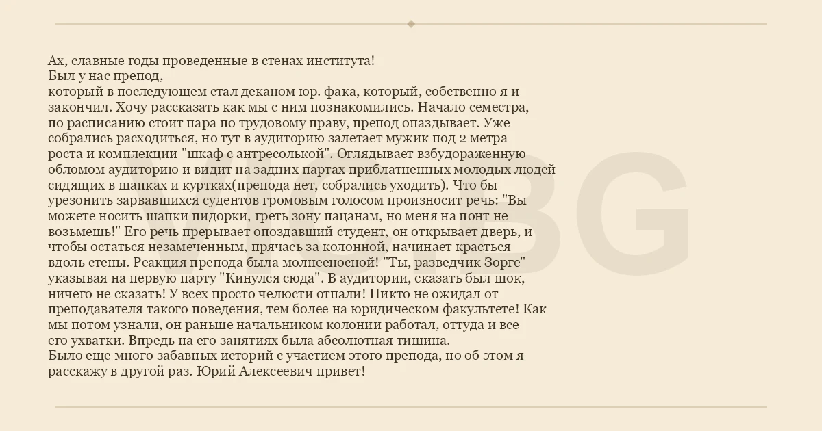 Ах, славные годы проведенные в стенах института! Был у нас препод, который в последующем стал деканом юр. фака, который, собственно я и закончил. Хочу рассказать как мы с ним познакомились. Начало семестра, по расписанию стоит пара по трудовому праву, препод опаздывает. Уже собрались расходиться, но тут в аудиторию залетает мужик под 2 метра роста и комплекции "шкаф с антресолькой". Оглядывает взбудораженную обломом аудиторию и видит на задних партах приблатненных молодых людей сидящих в шапках и куртках(препода нет, собрались уходить). Что бы урезонить зарвавшихся судентов громовым голосом произносит речь: "Вы можете носить шапки пидорки, греть зону пацанам, но меня на понт не возьмешь!" Его речь прерывает опоздавший студент, он открывает дверь, и чтобы остаться незамеченным, прячась за колонной, начинает красться вдоль стены. Реакция препода была молнееносной! "Ты, разведчик Зорге" указывая на первую парту "Кинулся сюда". В аудитории, сказать был шок, ничего не сказать! У всех просто челюсти отпали! Никто не ожидал от преподавателя такого поведения, тем более на юридическом факультете! Как мы потом узнали, он раньше начальником колонии работал, оттуда и все его ухватки. Впредь на его занятиях была абсолютная тишина. Было еще много забавных историй с участием этого препода, но об этом я расскажу в другой раз. Юрий Алексеевич привет!