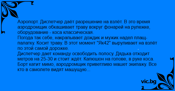 Диспетчер дает команду освободить полосу. Дядька отходит метров на 25-30 и стоит ждёт. Капюшон на голове, в руке коса. Борт катит мимо, аэродромщик приветливо машет экипажу. Все кто в самолете видят машущую фигуру...