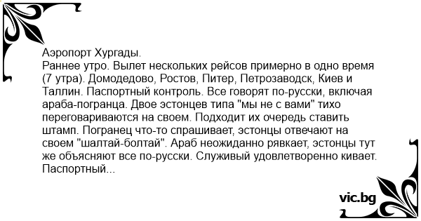 Раннее утро. Вылет нескольких рейсов примерно в одно время (7 утра). Домодедово, Ростов, Питер, Петрозаводск, Киев и Таллин. Паспортный контроль. Все говорят по-русски, включая араба-погранца. Двое эстонцев типа "мы не с вами" тихо переговариваются на своем. Подходит их очередь ставить штамп. Погранец что-то спрашивает, эстонцы отвечают на своем "шалтай-болтай". Араб неожиданно рявкает, эстонцы тут же объясняют все по-русски. Служивый удовлетворенно кивает. Паспортный контроль на великом и могучем продолжается...