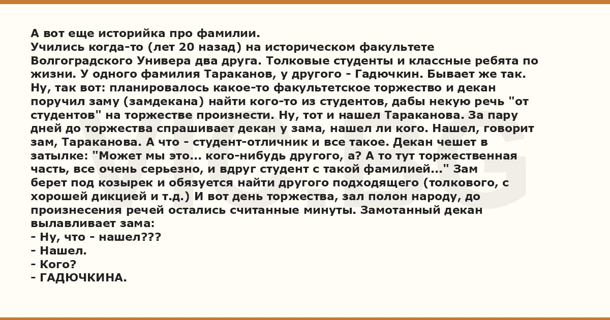 А вот еще историйка про фамилии. Учились когда-то (лет 20 назад) на историческом факультете Волгоградского Универа два друга. Толковые студенты и классные ребята по жизни. У одного фамилия Тараканов, у другого - Гадючкин. Бывает же так. Ну, так вот: планировалось какое-то факультетское торжество и декан поручил заму (замдекана) найти кого-то из студентов, дабы некую речь "от студентов" на торжестве произнести. Ну, тот и нашел Тараканова. За пару дней до торжества спрашивает декан у зама, нашел ли кого. Нашел, говорит зам, Тараканова. А что - студент-отличник и все такое. Декан чешет в затылке: "Может мы это... кого-нибудь другого, а? А то тут торжественная часть, все очень серьезно, и вдруг студент с такой фамилией..." Зам берет под козырек и обязуется найти другого подходящего (толкового, с хорошей дикцией и т.д.) И вот день торжества, зал полон народу, до произнесения речей остались считанные минуты. Замотанный декан вылавливает зама: - Ну, что - нашел??? - Нашел. - Кого? - ГАДЮЧКИНА.