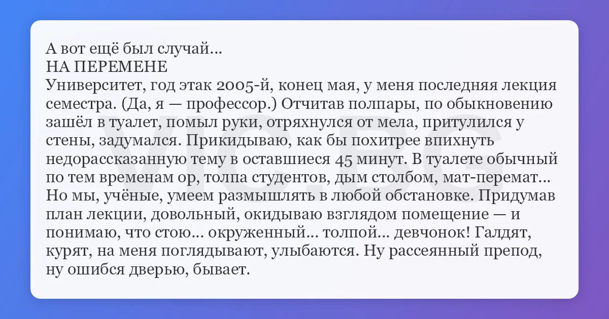 Университет, год этак 2005-й, конец мая, у меня последняя лекция семестра. (Да, я — профессор.) Отчитав полпары, по обыкновению зашёл в туалет, помыл руки, отряхнулся от мела, притулился у стены, задумался. Прикидываю, как бы похитрее впихнуть недорассказанную тему в оставшиеся 45 минут. В туалете обычный по тем временам ор, толпа студентов, дым столбом, мат-перемат... Но мы, учёные, умеем размышлять в любой обстановке. Придумав план лекции, довольный, окидываю взглядом помещение — и понимаю, что стою... окруженный... толпой... девчонок! Галдят, курят, на меня поглядывают, улыбаются. Ну рассеянный препод, ну ошибся дверью, бывает.