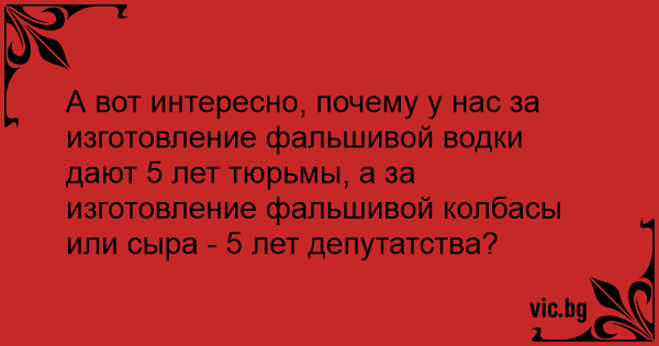 А вот интересно, почему у нас за изготовление фальшивой водки дают 5 лет тюрьмы, а за изготовление фальшивой колбасы или сыра - 5 лет депутатства?