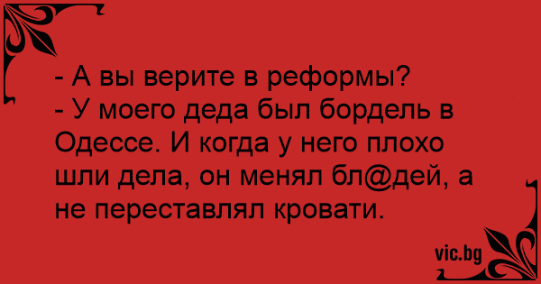 - У моего деда был бордель в Одессе. И когда у него плохо шли дела, он менял бл@дей, а не переставлял кровати.